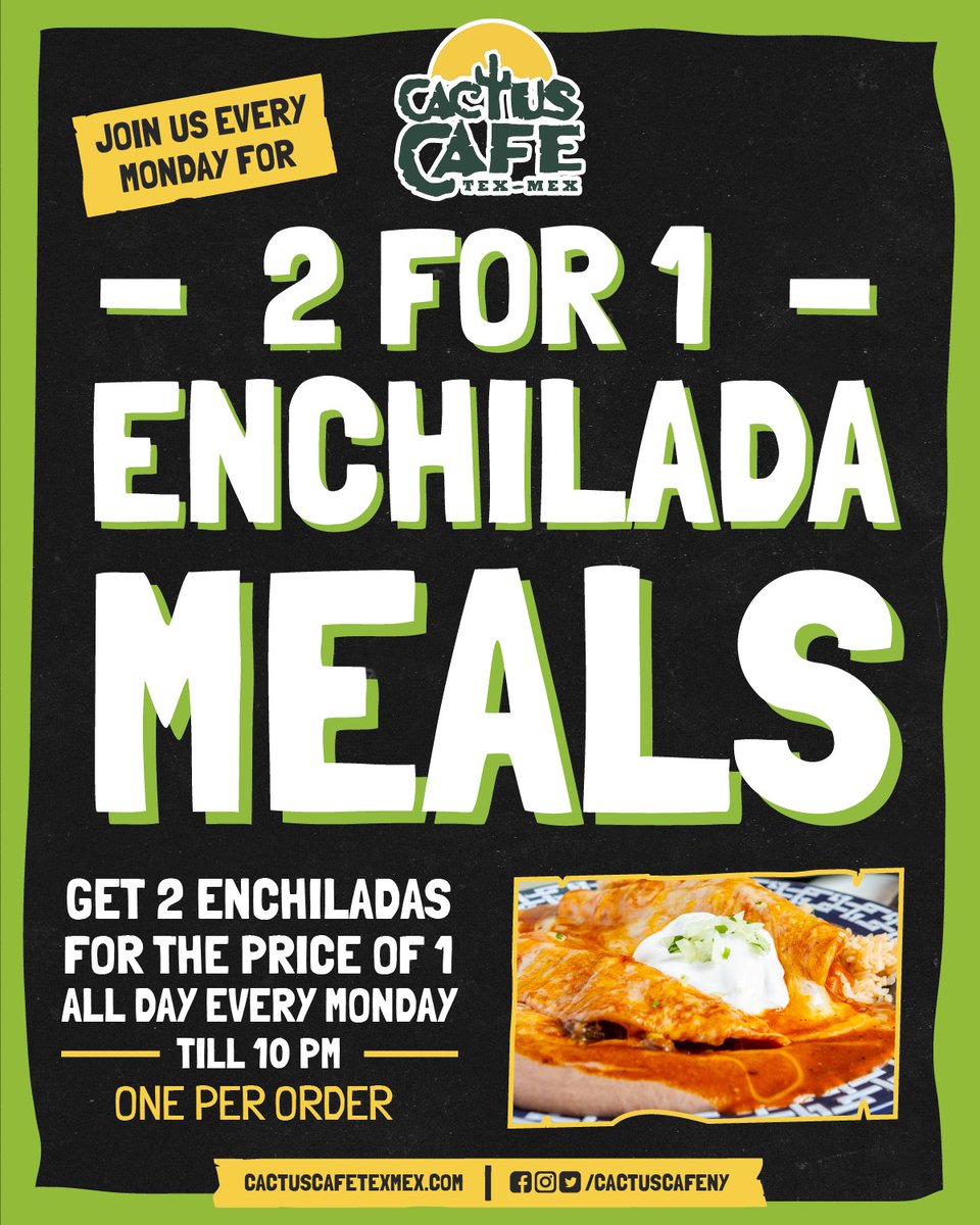 Monday 2 FOR 1 ENCHILADA. Sign up to recieve our newsletter emails. All day every Monday until 10pm.
